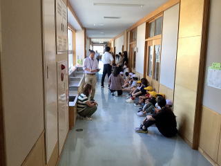 その後、津波が起きたことを想定して、垂直避難の訓練、教室へ戻って引き渡し訓練を行いました。